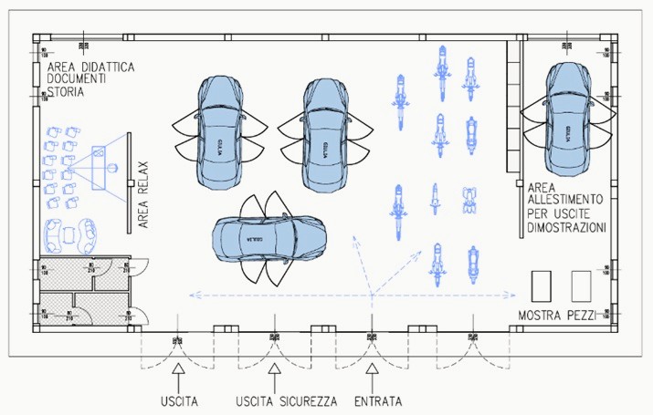 L’edificio, con tetto in legno, mattoni a vista ed ampie vetrate, avrà un’estensione di 350 metri quadrati, su un unico piano così da consentire l’accesso anche a chi abbia difficoltà di deambulazione, ospiterà a rotazione tre auto e 10 moto d’epoca e vi troverà spazio un’area dedicata alla didattica con sedie e schermo di proiezione. All’esterno la struttura sarà dotata di stalli idonei alla sosta di automobili e autobus.