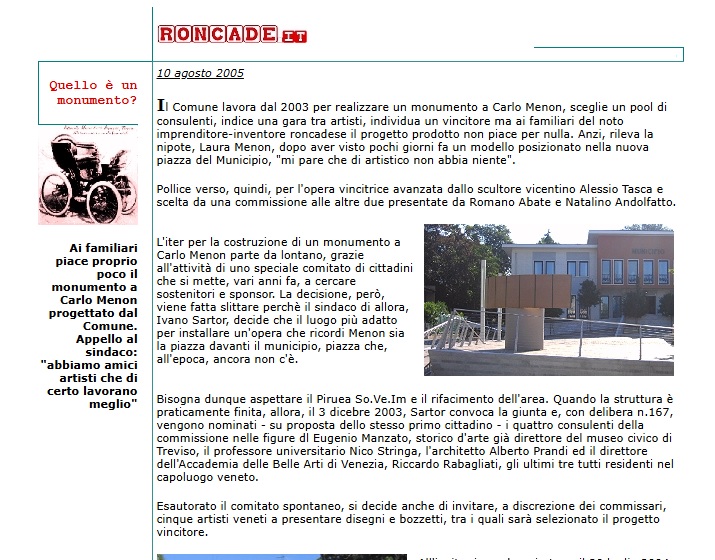 Laura Menon, nipote dell’inventore al quale il monumento avrebbe dovuto essere dedicato, in una lettera scrisse di ritenere, dritto per dritto, che il modello installato su un vertice dello spiazzo “di artistico non abbia niente”. “Abbiamo molti amici artisti – aggiunsero poi i discendenti con una lettera al sindaco – che avrebbero piacere di collaborare per onorare Carlo Menon”.